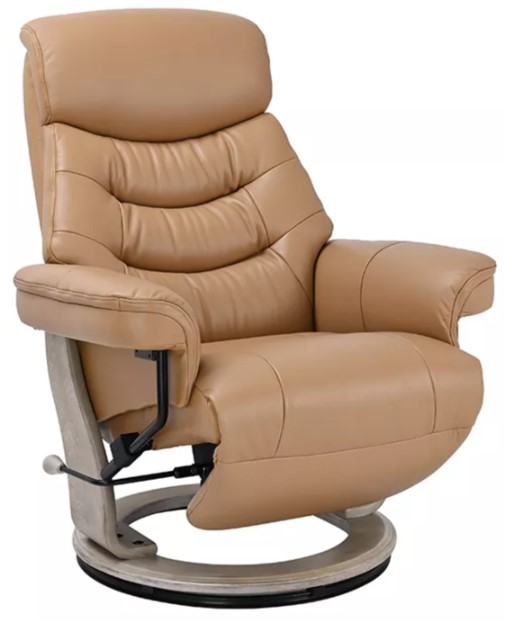 his Limited Edition Joy Recliner in Cinnamon features a 360° swivel base, manual flip-up footrest, and hidden adjustable headrest. With high-density foam padding and a sturdy steel-tube frame, it delivers contemporary comfort with rich leather-match upholstery and sleek space-saving design.Read More