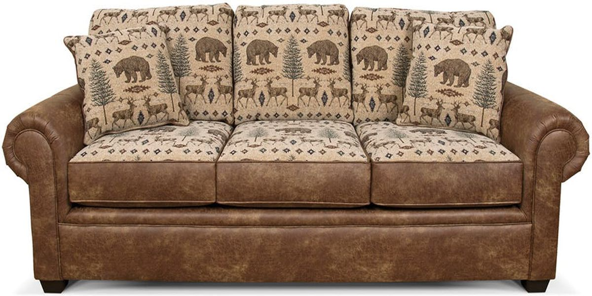 The lodge look is alive and well in our Jaden group. A three cushion style in married fabrics with pyramid legs and rolled and welted arms. Toss pillows are reversible. Novelty patterns combined with a leather-look fabrics provide the perfect choice for your cabin or retreat home.Read More