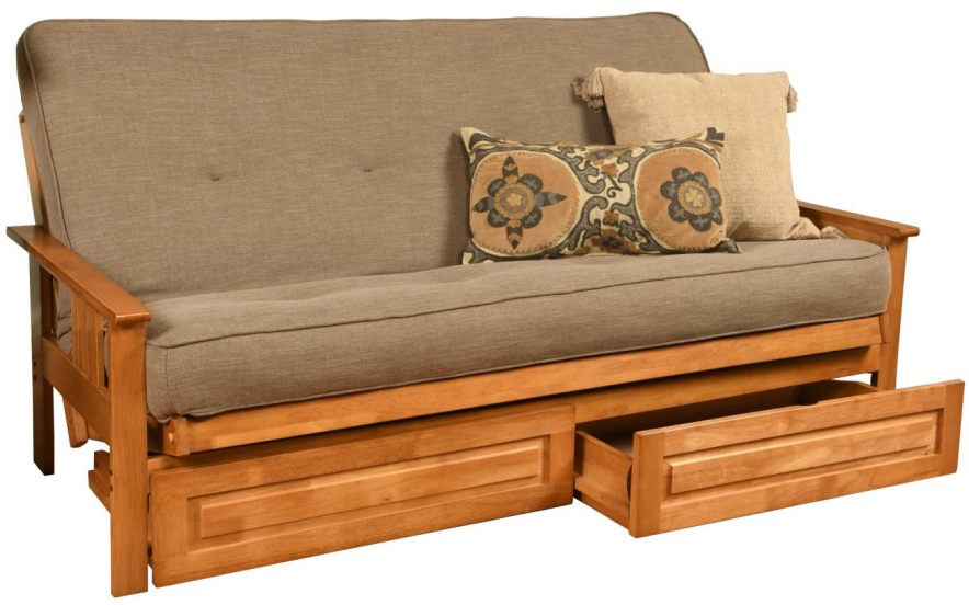 This futon frame has two optional drawers for out-of-sight storage