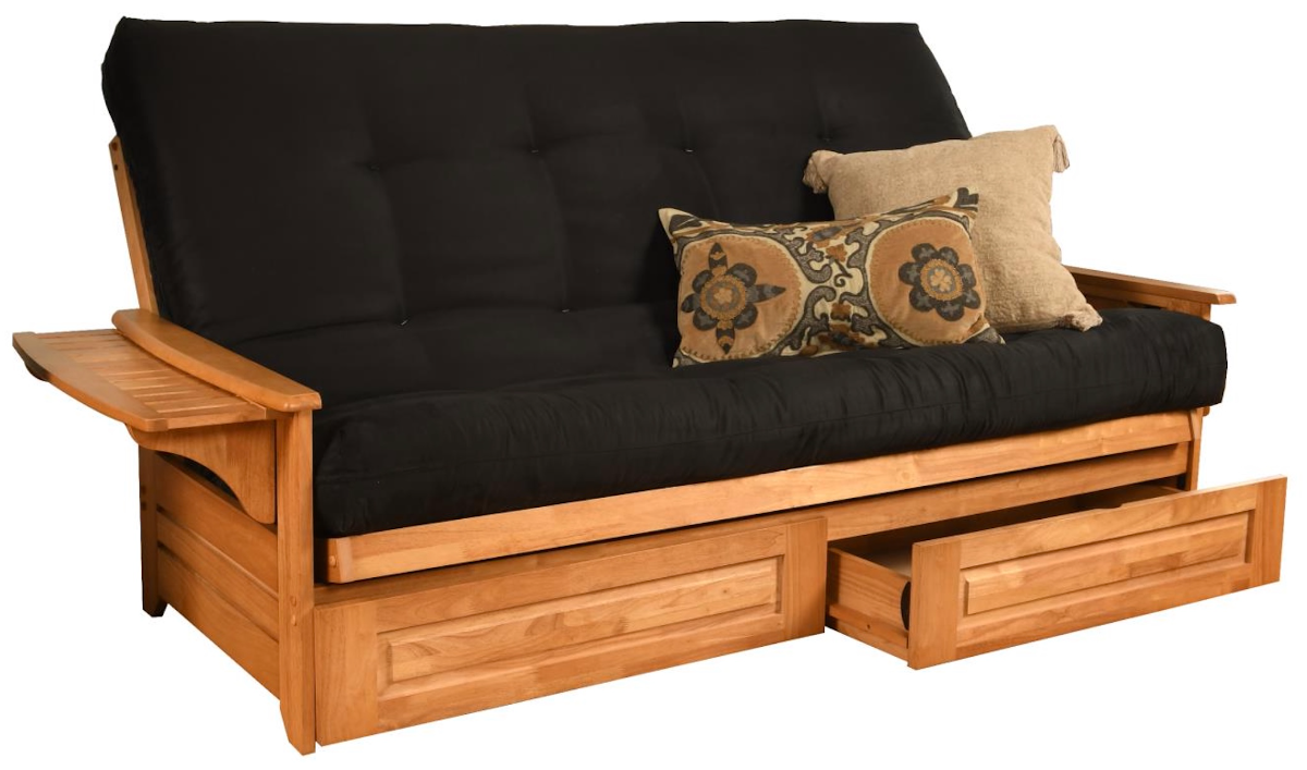 The Phoenix futon is a classic hardwood frame with tray style arms. This unique and versatile full-size futon sofa easily converts to a Bed. It offers three positions - sit, lounge and sleep to seemlessly transition from day to night. The included drawers offer plenty of additional storage space.Read More