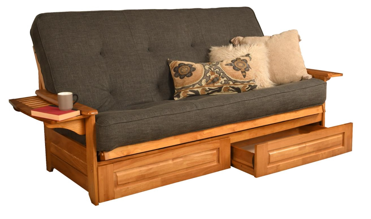 The Phoenix futon is a classic hardwood frame with tray style arms. This unique and versatile full-size futon sofa easily converts to a Bed. It offers three positions - sit, lounge and sleep to seemlessly transition from day to night. The included drawers offer plenty of additional storage space.Read More