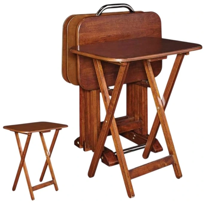 Four tray tables fold and store on the included stand