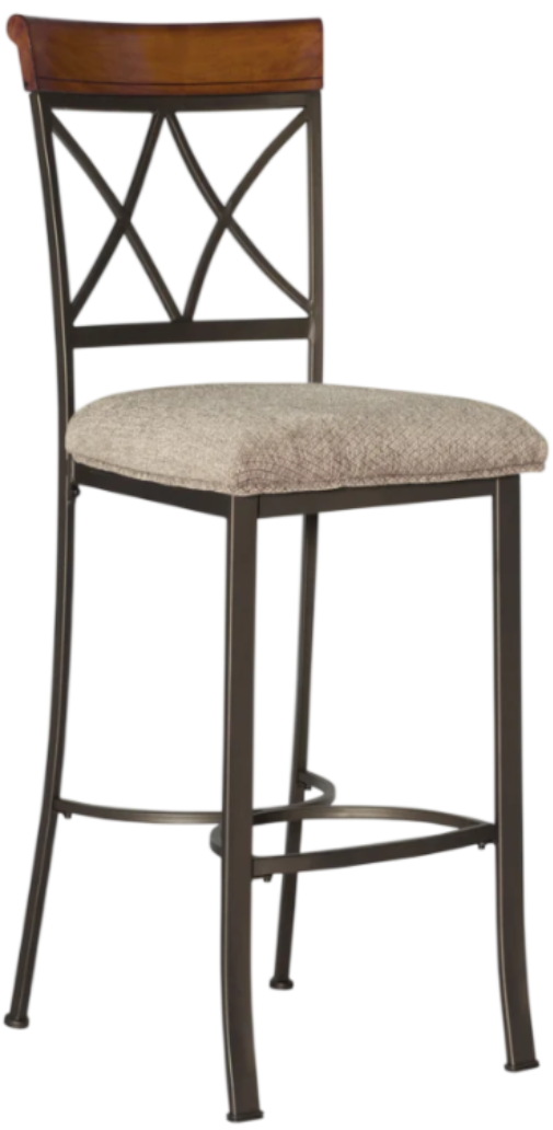 This bar stool features a diamond shaped back and slight curved legs. The top of the back piece is a sleek "brushed faux medium cherry" wood, while the frame is a "matte pewter and bronze" metal. This piece is sure to add interest and extra seating to your table.Read More