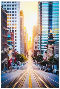 Dawn Breaking glass art details the early morning of a waking city street. This scene was captured as the rays begin to touch the city skyscrapers in the distance and before cable cars can start the day. The artwork provides depth and wonder to a place that usually has no time to stop.Read More